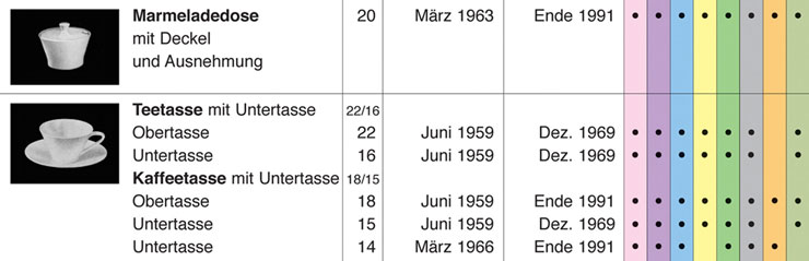 Erstmals wird die Geschichte der ÖSPAG und ihrer Tafelgeschirr-Formen im Zeitabschnitt von 1959 bis 1971 erzählt, gefolgt von einer Darstellung der Produktionszeiträume und einer Auflistung aller Dekore sowie die zu jener Zeit im Verkaufsprogramm befindlichen Hotelservice. | |||||||||